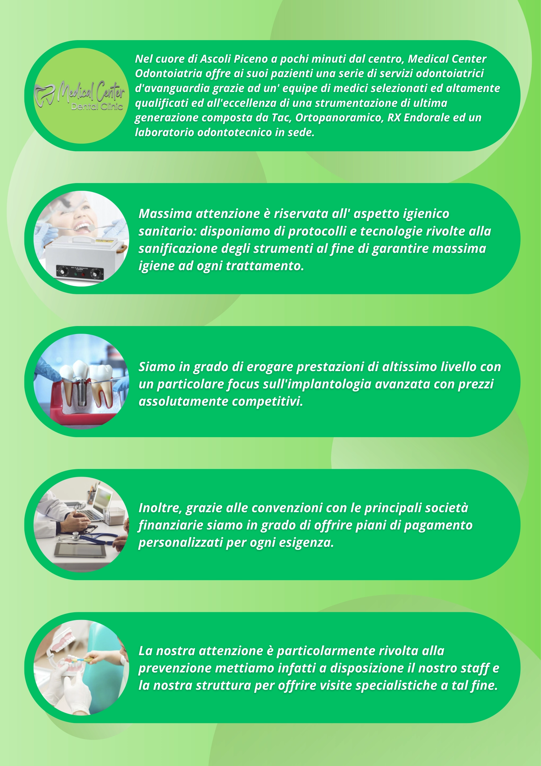 Con tecnica ad ultrasuoni a ridotta traumaticità, estrazioni di denti del giudizio, asportazione di cisti, biopsie e asportazione di lesioni potenzialmente cancerose, innesti di osso sintetico e fattori di crescita nei pazienti con insufficiente quantità di osso